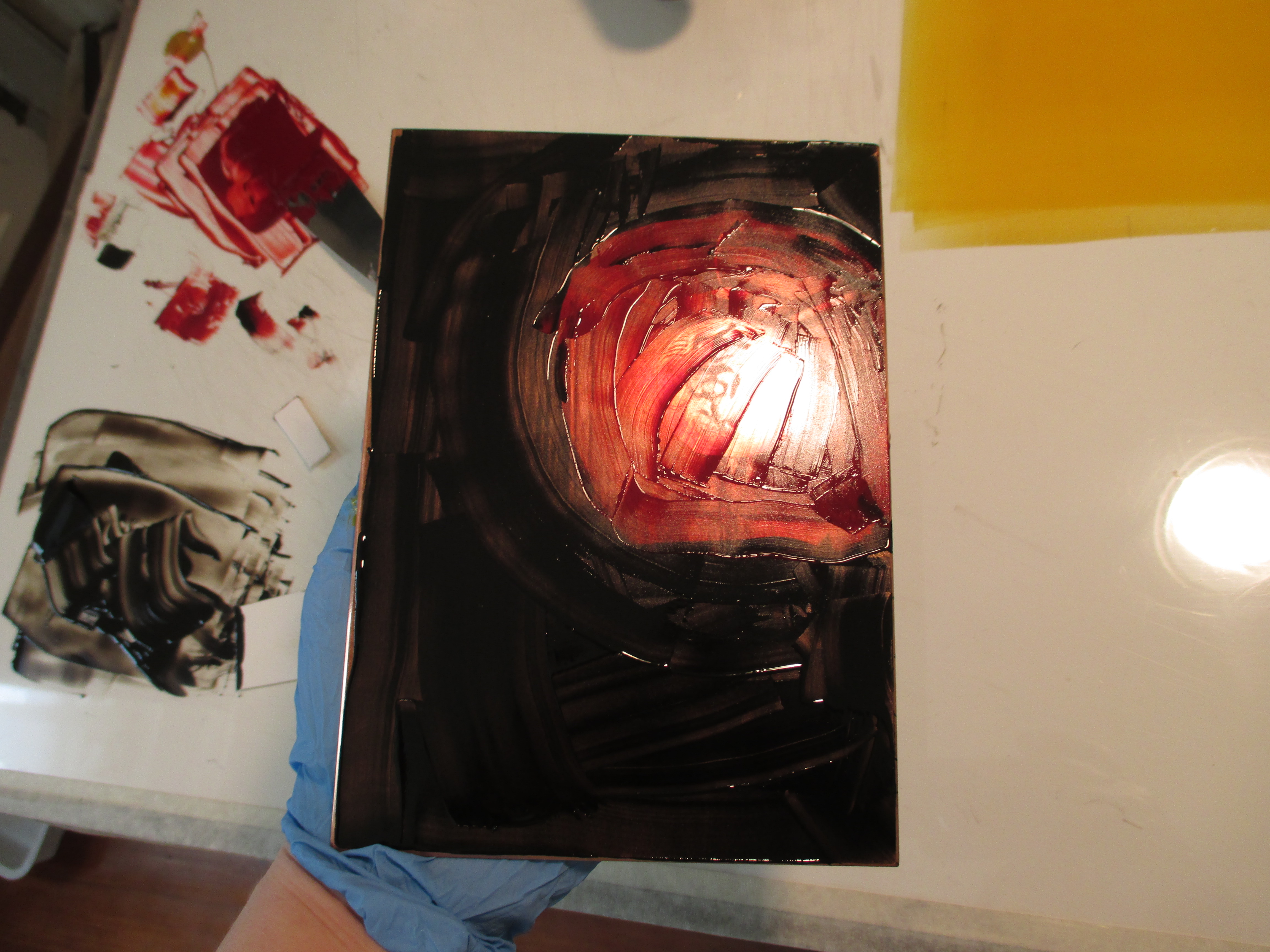 The plate has been worked and now I’m moving into the printing phase. My plan is for the final print to be in color and I’ve been experimenting with color applications and different papers. The colors I’ve chosen are a mixture of sepia, burnt sienna and lamp black for the background: