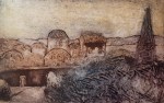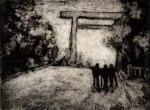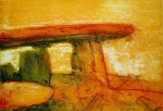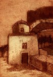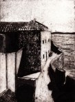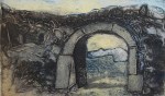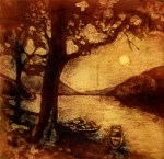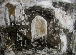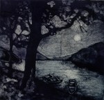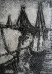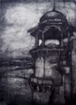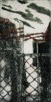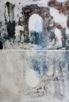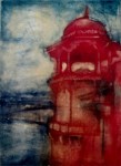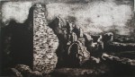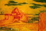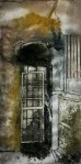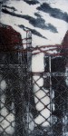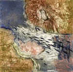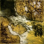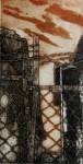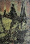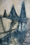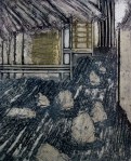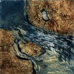 A collagraph is a printmaking plate created through collage onto a piece of mat board coated with gesso. I create the images using collage elements such as gesso, modeling paste, thread, sand, paper, net and plant matter. One can also cut into the plate or press objects into gesso to create texture. After sealing the plate with varnish, I ink the plate as one would with an intaglio plate, pushing the ink into the lines and textures and wiping the surface clean.
