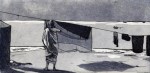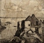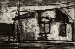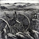 An etching is a plate, copper or zinc in my case, which has been etched with acid to create the design, and then inked in an intaglio fashion, pushing the ink into the lines and textures and wiping the surface clean. Two of the main forms of etching I use are line etching and aquatint. In line etching, the plate is covered with an acid-resistant ground and then scratched into to reveal the metal beneath. The acid eats away at the exposed part. With aquatint, the plate is covered with rosin dust or spray paint. When the plate is etched, the acid eats away around the particles of dust/paint to create grey tones or black areas.